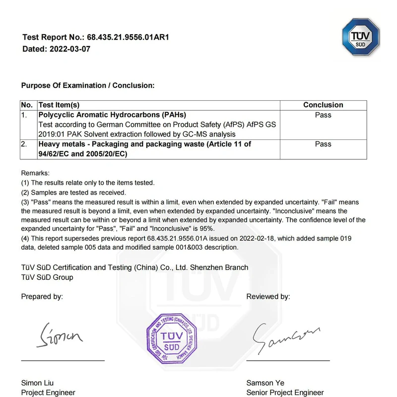 Our products have EU-certified REACH test report. For packaging and products, 94/62/EC, SVHC PAHs according AfPS have passed. We also passed California Proposition 65. Therefore, our products are not only high quality and durable, but also healthy and environment friendly.